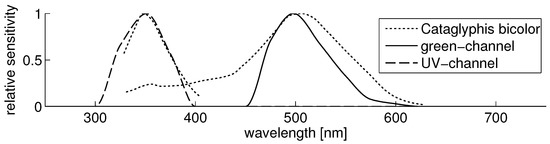 For desert ants of the species Cataglyphis bicolor, it is known that light in two different color channels in the UV (≈350 nm) and green (≈500 nm) range (Figure 4) is perceived [14]. While ants with trichromatic color vision have been found (Myrmecia vindex [15]), which have an additional blue color channel (≈450 nm), they share the UV and green color channel. Figure 1 shows irradiance spectra of direct sunlight and blue sky, as well as reflectance spectra of limestone and dry grass. For objects on the ground, the reflectivity in the UV channel is commonly small (especially compared to visual light), while the UV portion of direct sun light and blue sky is high. Therefore, there is a high contrast between sunlight reflected from ground objects and the sky. As proposed by Wehner [16], this allows a simple classification between ground objects and the sky (resulting in a binary skyline) in the UV channel by determining an appropriate threshold. This idea is supported by behavioral experiments with the ant Melophorus bagoti, where it could be shown that their navigational abilities are significantly decreased as soon as UV light is blocked [17]. The lower reflectivity of ground objects in the UV channel compared to the green channel motivates an alternative approach: instead of only using the UV channel for skyline extraction, a contrast of the UV and green channel can be used [11]. The spectral characteristics of ground objects under natural illumination, as well as the difference in the spectra of light emitted directly from the sun and diffuse lighting from the sky have been examined by [11,18]: using a handheld device containing two photodiodes sensitive to UV and green light, databases have been collected, which contain log UV/G data for a wide range of ground objects and sky patches. The data show that a simple linear separation of the logarithmized UV/G data (in the following denoted as log UV/G) is sufficient to correctly classify most of the collected data into two classes, ground objects and sky. Since the databases contain objects and sky patches recorded under different lighting and weather conditions, this suggests that, using an appropriate log UV/G contrast mechanism, a threshold can be found to reliably extract the skyline.