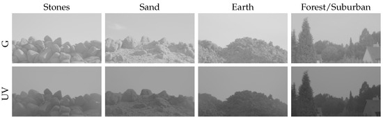 Examples of captured HDR images with our camera setup taken at 17:00 for both the UV and green channel. The first three columns show different mineral skylines (stones, sand, earth), while the last column shows a skyline in a suburban area of Bielefeld (forest/suburban).