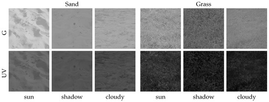 Single HDR images of sand and grass captured with our camera setup for both the UV and green channel. A total of three different images have been taken for each object: Two images were taken on a sunny day, one time where the object is exposed to the sun (sun) and one time lying in the shadows (shadow). A third one was collected during a cloudy day (cloudy).