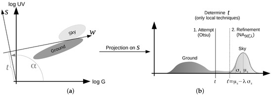 (a) (projection): Global and local separation techniques project the log UV/G data onto a hyperplane s with angle α. The angle α is always fixed for all global separation techniques, as well as the local technique . (b) (threshold selection): While the threshold value t is learned from a large set of training images for global separation techniques, local separation techniques learn it for each input image pair (log UV and log G) individually. Local separation techniques maximize Otsu’s criterion by iterating the threshold values t. Furthermore, the technique approximates a normal distribution to the sky class (based on the threshold t) and refines the threshold value based on this distribution as , where λ is a correction factor.