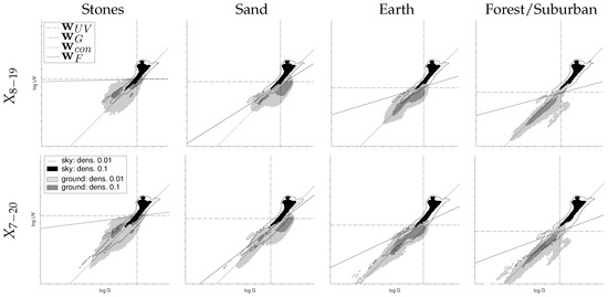 The columns show the log UV/G plots of the three mineral skylines (stones, sand, earth) and the skyline dominated by trees from the previous study (forest/suburban). Note that in each plot, the pooled sky data of all skyline databases are shown, representing a wide variety of weather conditions (the slightly different appearance is due to normalization). Each row shows the data recorded at day times between 8:00–19:00 and 7:00–20:00, respectively. The lines show the global linear separators that maximize the classification rate for each presented log UV/G dataset: (UV-only), (green-only), (contrast: 1:1) and (contrast: Fisher discriminant). The classification rate of these separators can be found in Table 1. The black region and the black outline show the density level of the sky class for the levels and after transforming the point cloud into a continuous distribution by superimposing a Gaussian at each point (), respectively. Analogously, these levels are represented for the ground class by dark and light gray areas (Section 2.2). On each tick mark, the irradiance value is doubled, representing a ‘stop’ in camera terminology.