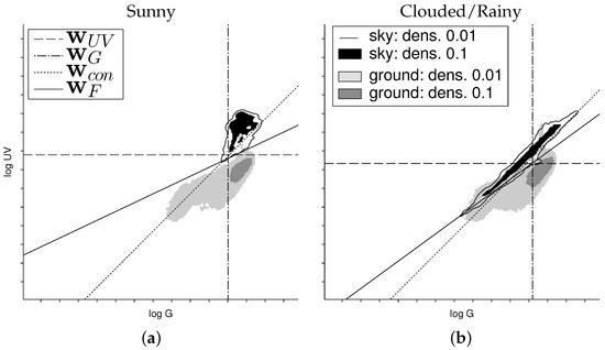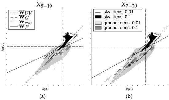 By super-positioning a narrow Gaussian distribution () for an arbitrary set X of log UV/G data into a plot with the log G values on the X-axis and log UV values on the Y-axis, a continuous distribution of the log UV/G data can be visualized (in the following called log UV/G plots). Since the classification as a ground object or sky is available for all recorded log UV/G data (Section 2.3), we can plot a distribution for both classes. For better comparison, the log UV/G plots are normalized to the interval , where 1 is the maximum value of both distributions. In all of the plots, the levels and are highlighted (Figure 9 and Figure 10) to get a better visual impression of the data.