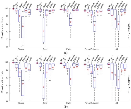 Box plots of the classification rates for the local separation technique and all global separation techniques (UV/green/contrast/Fisher/mask). As for the results presented in Table 1, the global separation techniques were trained on samples drawn from the specified databases, but in contrast, this evaluation uses single HDR image pairs (e.g., as captured by a mobile robot) as test data. The numbers of HDR image pairs classified in each box plot are for (a) and (b) : stones, sand, earth: ; forest/suburban: ; all: . The box plots show the distribution of the classification rates for all separation techniques and databases. Each plot shows the mean (red circle), median (black line), the 25th and 75th percentiles (blue box) and a coverage of (black dashed lines). For better readability, outliers are not shown.