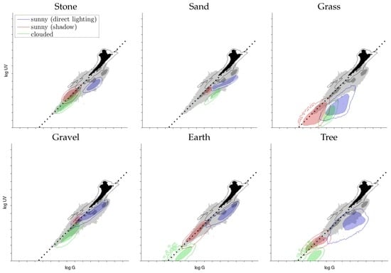 A total of 61 different samples of ground objects has been collected. This plot shows six different ground objects, each recorded under three different conditions: the object lies in the sun (blue) or in the shadow (red), both on a sunny day, or the object was recorded on a cloudy day (green). For comparison, the pooled data (ground and sky) from Figure 10 () are shown together with the best 1:1 contrast separator (, dotted line). Examples of the log UV/G data used to create the sand and grass plots are presented in Figure 6.