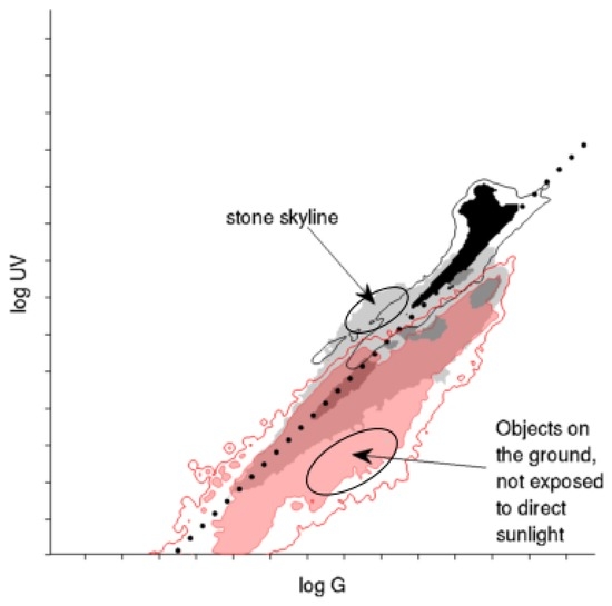 Figure 14 shows a log UV/G plot of the object database. The wide variety of different objects and lighting conditions (partly in the same image) does not allow a unique distinction of the lighting conditions as in Figure 13; therefore, the data of the complete object database are pooled. The log UV/G plot might give the impression that the collected objects have lower UV values compared to the skyline databases. This is due to the overall smaller amount of direct sunlight in most scenes where the object database has been recorded (forest, bushes, etc.) compared to the skyline databases, which were mostly recorded in well-lit scenes.