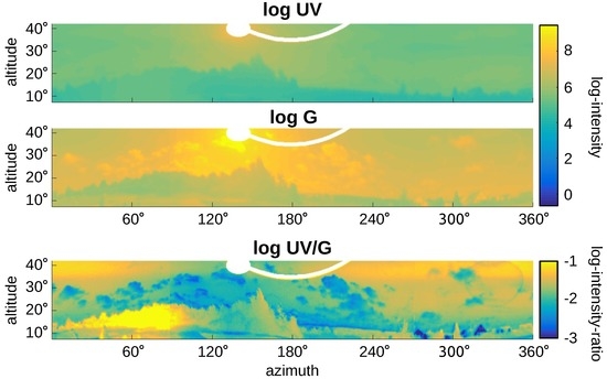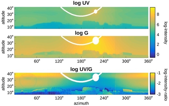 Figure 15 and Figure 16 show panoramic images captured on sunny days in the vicinity of Bielefeld University. They show the raw (non-normalized) log UV and log G values obtained by the HDR algorithm and their ratio , denoted by log UV/G. The blue sky in Figure 15 shows a gradient of UV and green light over the sky [41,42], while Figure 16 shows the strong influence of clouds. Unfortunately for global separation techniques, also the log UV/G contrast differs strongly between data points close to the sun compared to data points opposite to the sun, increasing the difficulty of applying a global threshold. The experimental setup used to capture the skyline databases was always pointing in the same direction (mostly north); however, due to the movement of the Sun, the appearance of the sky differs strongly over the day. The same effect appears for local separation techniques; however, they can adapt their thresholds for smaller segments of the image individually, which is not possible for global separation techniques.