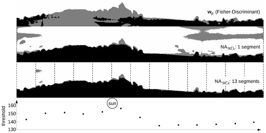 Figure 17 shows how the global separation technique and the local separation technique (UV-only separation) compare on the panoramic image with direction-dependent lighting conditions shown in Figure 16. As can be seen, the global separation technique (classification rate: 82.1%) misclassifies around regions that are brightly lit by direct sunlight, while the local separation technique (classification rate: 87.4%) misclassifies large regions of the sky that are opposite of the Sun. For the latter, this problem can be avoided by using different thresholds for different parts of the panoramic image. Here, we calculated the threshold values for a total of 13 segments (each spanning an azimuthal angle of around ), which increases the classification rate to 98.0% (for this image). The number of segments has been chosen as a trade-off between too few segments (no adaptation to differing lighting conditions) and too many segments (small segment sizes might lead to unstable results from Otsu’s method). The skyline extraction could furthermore be smoothed by linearizing the threshold values between neighboring segments, resulting in an individual threshold for each column.