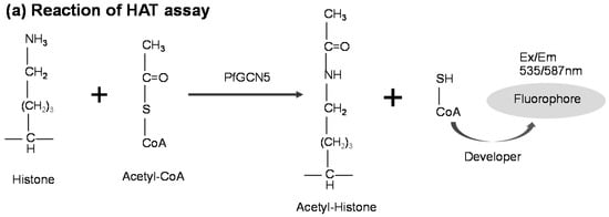 To purify the PfGCN5 HAT from the malaria parasite Plasmodium falciparum, a PTP (ProtC-TEV-ProtA) tag was added to the C-terminus of the endogenous PfGCN5 gene in the malaria parasite as described before [36,37]. Briefly, ~1 kb fragment from the C-terminus end (without the stop codon) of PfGCN5 was amplified and fused to the PTP tag and 3′ UTR region of the P. berghei dhfr-ts gene and cloned into the transfection vector pHD22Y with the human DHFR resistance cassette. Parasite transfection, drug selection, and cloning were performed as described [36,38]. Positive clones were verified by integration-specific PCR. The malaria parasites with PTP-tagged PfGCN5 were cultured using a standard procedure [39] and the PfGCN5 was purified by IgG beads under the native condition as described previously [36]. The purified protein was stored at −80 °C until enzymatic analysis.