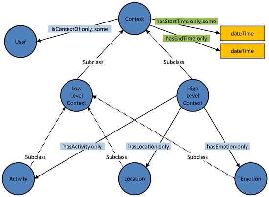 The main concept of the Mining Minds Context Ontology is the class Context, which represents the context of a user in an interval of time. Several necessary conditions are described for this class to model the concept of context (Figure 2). The existential and universal restrictions on the object property isContextOf ensure that any individual of the class Context is linked to an individual of the class User representing the user to which the context belongs. The existential and universal restrictions on the functional data property hasStartTime state that all of the individuals of the class Context must be related along this property to a unique dateTime data type of the W3C XML Schema Definition Language (XSD) [36] representing the instant of time in which the context starts. The universal restriction on the functional data property hasEndTime indicates that if there is a relationship of an individual of the class Context along the property hasEndTime, it has to be to a member of the XSD dateTime data type representing the end time of the interval in which the context is valid.