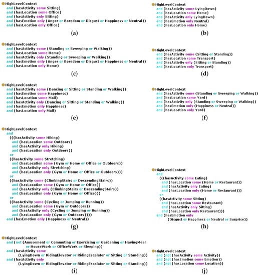 The class LowLevelContext represents the basic categories of low-level contexts via the classes Activity, Location and Emotion. The class HighLevelContext models the concept of high-level context. The universal restrictions on the object properties hasActivity, hasLocation and hasEmotion model the relationship between the individuals of the class HighLevelContext and the individuals of the different subclasses of LowLevelContext, which compose the high level context. The different types of high-level contexts are modeled via ten subclasses of the class HighLevelContext. Their equivalent anonymous classes as defined in Protégé [37] are presented in Figure 3.