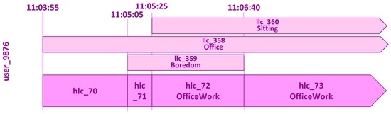 An illustrative scenario is presented here to showcase the representation of instances of low-level contexts and high-level contexts in the Mining Minds Context Ontology (Figure 4). Let us imagine that it is 10 November 2015, and the user with identifier 9876 enters at 11:03:55 the office building of her or his working place. This event is detected by a location detector, a positioning system that interprets the coordinates of the user as the location of her or his office. Therefore, the low-level context of category location is identified as being of type office at 11:03:55. She or he starts talking on the phone, and a system capable of recognizing emotions detects from the tone of her or his voice that the user is bored. Thus, the low-level context of category emotion is identified as being of type boredom at 11:05:05. The phone call finalizes at 11:06:40, and then, no emotion is detected anymore. Meanwhile, at 11:05:25, the user sits down at her or his workplace. This event is detected by an activity recognizer that continuously measures her or his body motion. The low-level context of category activity is identified as being of type sitting at 11:05:25. It should be noted that every change in any of the low-level contexts may potentially lead to a new high-level context. For example, at 11:05:05, the combination of the activity sitting, the location office and the emotion boredom creates a high-level context that is classified as office work. At 11:06:40, when the emotion is no longer available, but the activity remains as sitting and the location as office, the high-level context for this user continues being identified as office work. Some combinations of low-level contexts do not constitute a known class of high-level context, based on the defined ontology. This is the case of the two high-level contexts at the beginning of this scenario. Namely, only location or the combination of the location office and the emotion boredom turn out to be not enough to identify a more abstract high-level context. Each context has associated a name, which serves as a unique identifier. These names are automatically created by the system whenever a new context is detected and are composed of the prefix “llc_” or “hlc_” and a sequential unique number. For the sake of simplicity, in this example, up to three digits are considered; however, large numbers are normally used by the system to procure unique identifiers. Furthermore, in order to make the example more understandable, for the low-level contexts, the membership of the instance to its name has been appended. For example, the context representing the activity sitting is named llc_360_sitting.