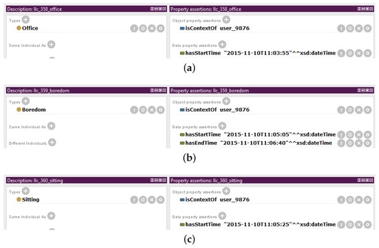Representation of the instances of low-level context for the exemplary scenario by using the Mining Minds Context Ontology in Protégé. (a) llc_358_office is a member of the class Office; (b) llc_359_boredom is a member of the class Boredom; and (c) llc_360_sitting is a member of the class Sitting.