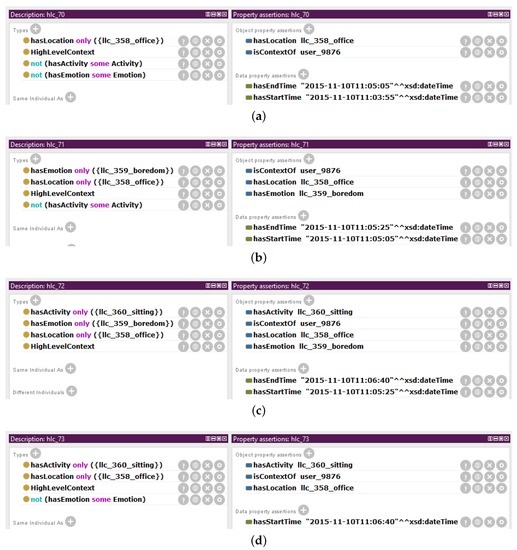 Representation of the instances of unclassified high-level context for the exemplary scenario by using the Mining Minds Context Ontology in Protégé. (a) hlc_70; (b) hlc_71; (c) hlc_72; and (d) hlc_73 are composed of some of the low-level contexts llc_358_office (member of the class Office), llc_359_boredom (member of the class Boredom) and llc_360_sitting (member of the class Sitting).