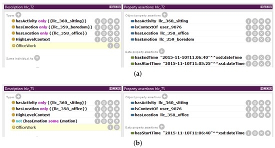 The individual hlc_72 is inferred by the reasoner to belong to the class OfficeWork (Figure 7a). Since this individual of the class HighLevelContext complies with the definition of the class OfficeWork, it is classified as being a member of this class. hlc_72 fulfills the existential and universal restrictions on the property hasActivity, which state that a member of the class OfficeWork must have some hasActivity relationship to an individual of the class Sitting and only to a member of this class. These restrictions are met since the property hasActivity only links the individual hlc_72 to the individual llc_360_sitting, which is a member of the class Sitting. Similarly, hlc_72 also fulfills the existential and universal restrictions on the property hasLocation. Furthermore, hlc_72 fulfills the universal restriction on the property hasEmotion, which states that in the case a member of the class OfficeWork has a hasEmotion relationship, it has to link to only an individual of the class Boredom. In fact, hlc_72 is only related along the property hasActivity to the individual llc_359_boredom, which is a member of the class Boredom.