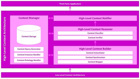 The Mining Minds High-Level Context Architecture (HLCA) is the system architecture devised for the identification of the user context in Mining Minds. Conversely to most similar approaches, the HLCA supports the instance-based identification of context. The HLCA infers abstract context representations based on categories, such as physical activities, emotional states and locations. These categories, which are derived from the wide-spectrum of multimodal data obtained from the user interaction with the real- and cyber-world, are intelligently combined and processed at the HLCA in order to determine and track the user context. The inferred user context can be utilized by the Mining Minds entities and any other third party to enable the provision of personalized health and wellness services. The HLCA relies on the Mining Minds Context Ontology (Section 3) and applies ontological inference to identify the user context. Furthermore, the ontology is utilized in the representation of the context shared between the components of the HLCA. The HLCA consists of four main components (Figure 8): High-Level Context Builder (Section 4.1), High-Level Context Reasoner (Section 4.2), High-Level Context Notifier (Section 4.3) and Context Manager (Section 4.4).