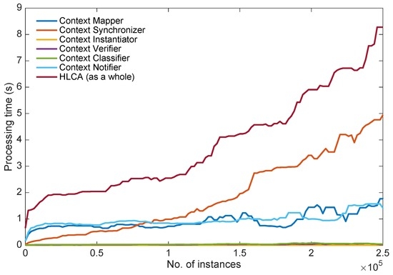 Figure 9 shows the time invested by each of the HLCA components and the system as a whole in the context identification process. The number of instances indicates the number of high-level contexts which have already been processed by the HLCA when the recognition process is triggered due to a change in the low-level context. Even if the context recognition process is performed instance-wise, the number of previously processed instances is important because of the volume of information generated by the system during the recognition process and persisted in the Context Storage. The processing times are further averaged to have an overall figure summarizing the time taken by the each component of the HLCA. Table 2 presents the mean and standard deviation of these times as well as the percentage of these times devoted to the interaction of the component with the Context Manager. This interaction is particularly relevant because the Context Manager hosts the Context Storage, the shared resource which persists and loads the context information.