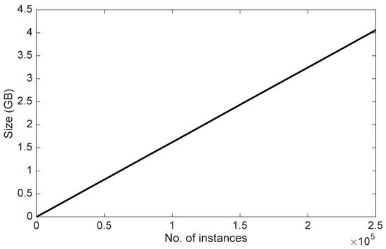 Size of the Context Storage depending on the number of persisted instances of high-level context. It must be noted that the storage of each high-level context instance has associated the storage of the low-level context instance which triggered its creation. Thus, for example, 250,000 instances in the X-axis represent 250,000 high-level contexts plus 250,000 low-level contexts stored on disc.