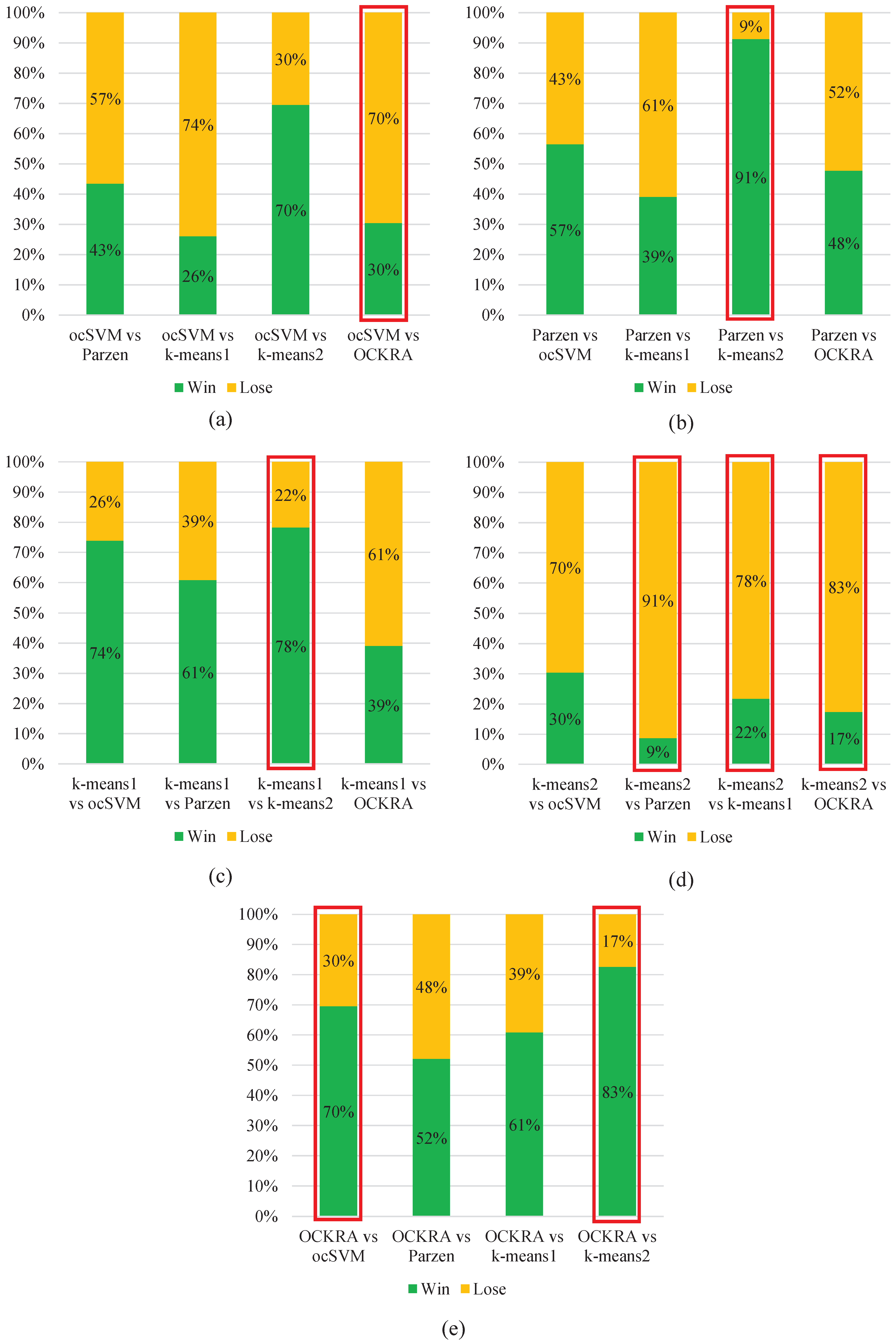 Figure 1 show that OCKRA and k-means1 outperformed Parzen and k-means2, and there was no significant difference between OCKRA and k-means1. The ROC curves in