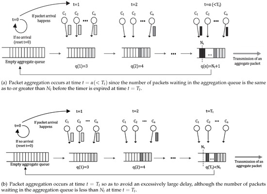 The packet aggregation process occurrence at time is inspired by the aggregation timer (i.e., and ) or by the packet aggregate threshold (i.e., , and ). To describe the above conditions simply, we define new random variable as: