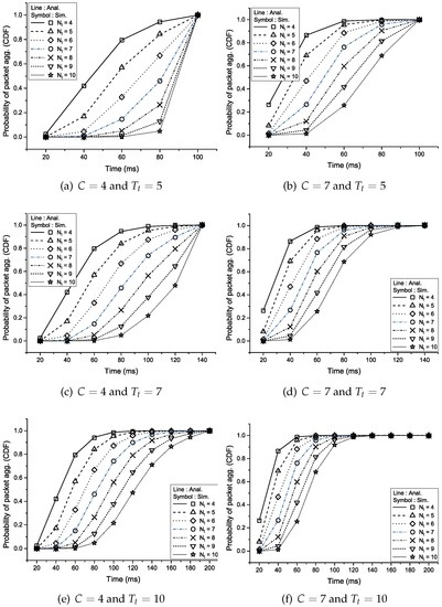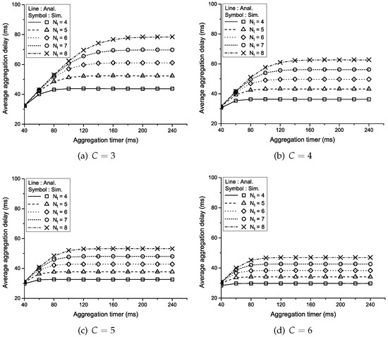 Figure 3 shows the average aggregation delay versus the aggregation timer according to the aggregation threshold () and the number of traffic sources (C) when the packet generation probability () is 0.4. As the aggregation timer increases, so does the time necessary to generate an aggregated packet, which results in a linear increase in the aggregation delay at the relatively small range of the aggregation timer. However, when the aggregation timer is large enough, most of the aggregated packets are generated by the aggregation threshold, which explains the saturation of the aggregation delay as the aggregation timer increases. Namely, the aggregation delay is bounded below a certain level by some values of the aggregation threshold and the aggregation timer. As the aggregation threshold increases, the time to wait for a packet to be aggregated into a single aggregated frame increases, which results in an increase in the aggregation delay. On the other hand, as the number of traffic sources increases, there are more packet arrivals in the aggregation queue per unit time, which means that the time required to construct an aggregated packet is shorter and the average aggregation delay decreases.
