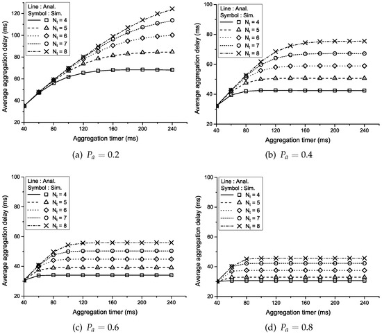 Finally, combining Equations (24) and (34) with Equation (19), the average aggregation delay is calculated as follows.