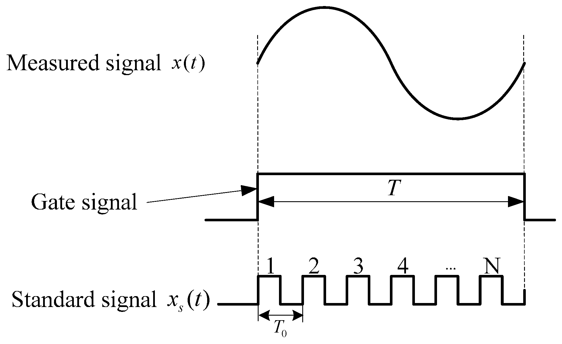 A measured signal x(t) is converted into a gate signal through a shaping circuit. Under the circumstances that the standard frequency signal xs(t) with higher frequency is taken as a periodic pulse signal, the measured signal is calculated by pulse counting within a gate time T. Assuming that the count value is N, the cycle of measured signal and standard signal are Tx and T0, respectively. Then, the cycle of the measured signal is: