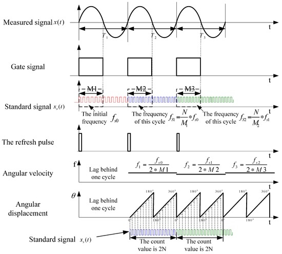 The principle of the self-adaptive frequency tracking measurement method is shown in Figure 2. Supposing that measured signal is x(t), the standard signal is xs(t). When the pulse counting value is fixed at N, the cumulatively output angular displacement is 180°. The frequencies of the first three cycles of the measured signal are f1, f2 and f3, respectively. The corresponding frequencies of the first three cycles of the standard signal are fs0, fs1 and fs2, respectively. The half period of the measured signal x(t) is taken as gate time after processing the signal with shaping circuit modulation.