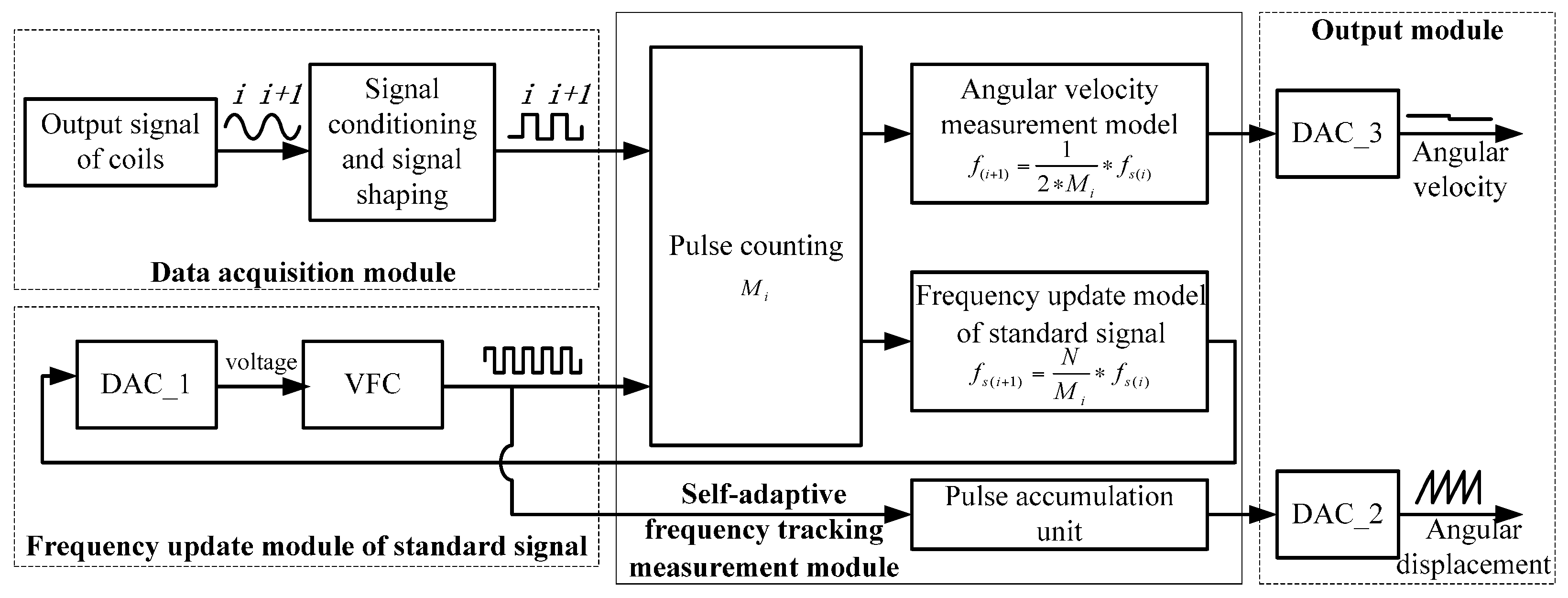 System architecture and a specific design scheme of the prototype of the sensor are given in Figure 3. The sensor consists of five parts, including a data acquisition module, standard signal frequency update module, self-adaptive frequency tracking measurement module and output module.