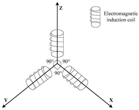 Under the conditions of different rotational speeds of a high-speed rotating projectile, an electromagnetic induction coil is employed to obtain the real-time information about the projectile movement across a geomagnetic field. According to Faraday’s Law of Electromagnetic Induction, a framework of a bent “I-shape” type is used to wind an uniaxial coil, whose wire diameter is 0.09 mm, number of turns is 9500, and resistance is about 665 Ω. Simultaneously, triaxial coils are installed in a mutually orthogonal way to realize the measurement of triaxial geomagnetic signals, as shown in Figure 4.