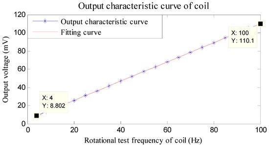The linearity of the induction coil is calibrated by linear fitting. The characteristic output curve and fitting curve are shown in Figure 5.