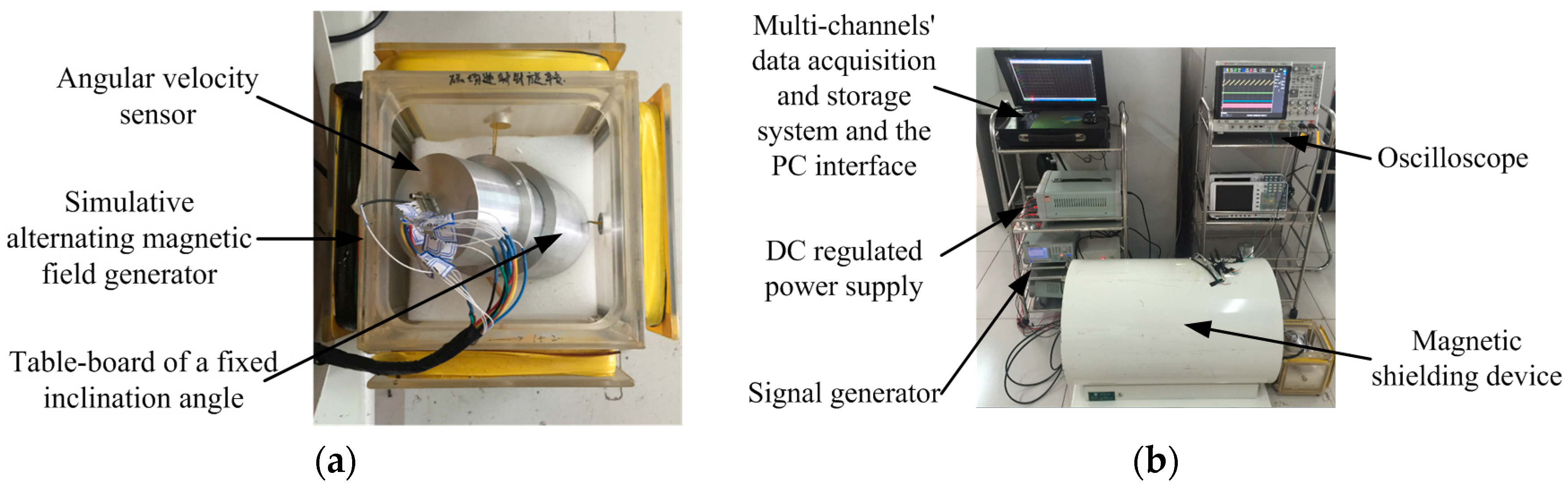 Experimental test platform of the simulative alternating magnetic field: (a) Simulative magnetic field generator; (b) Experimental test platform.