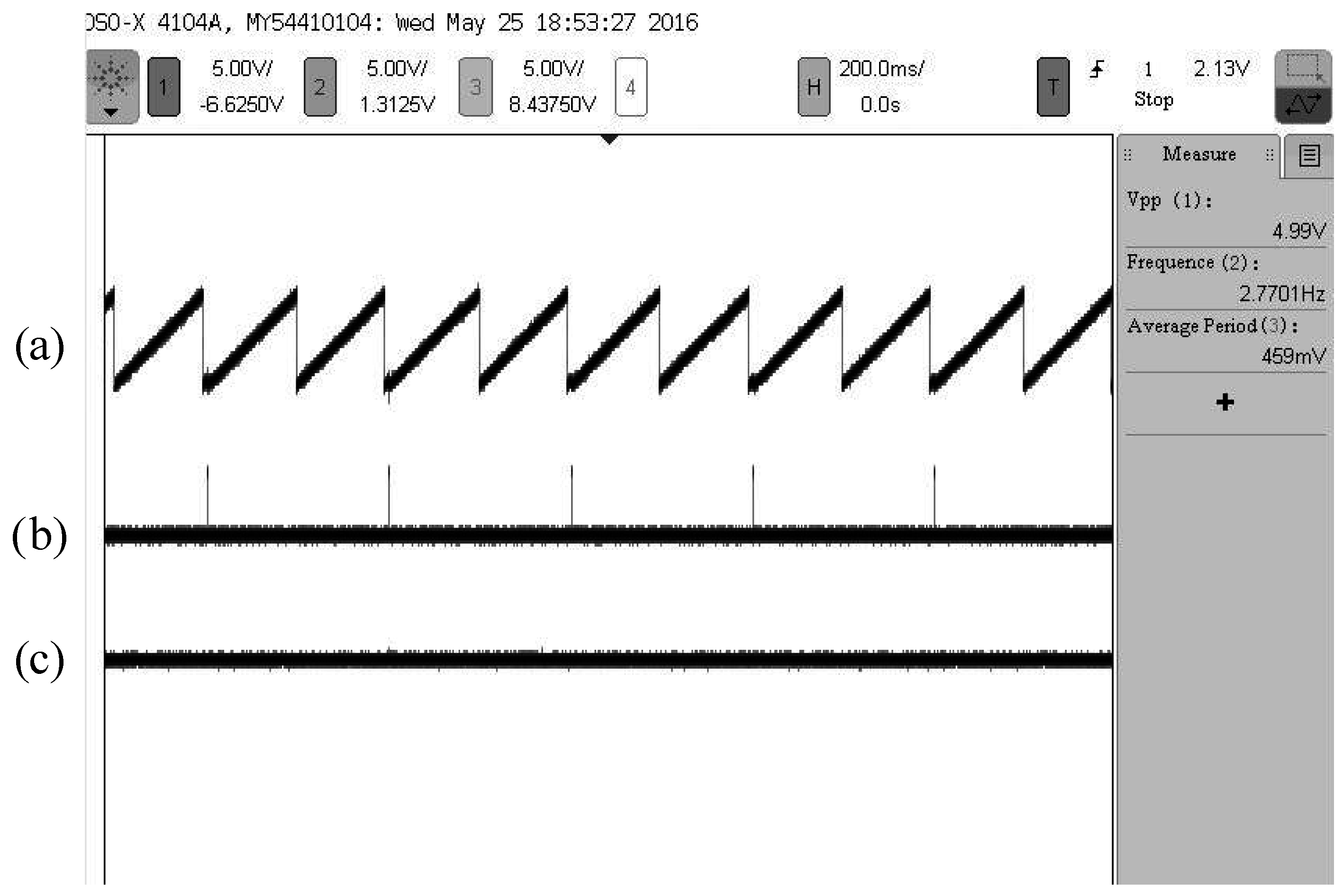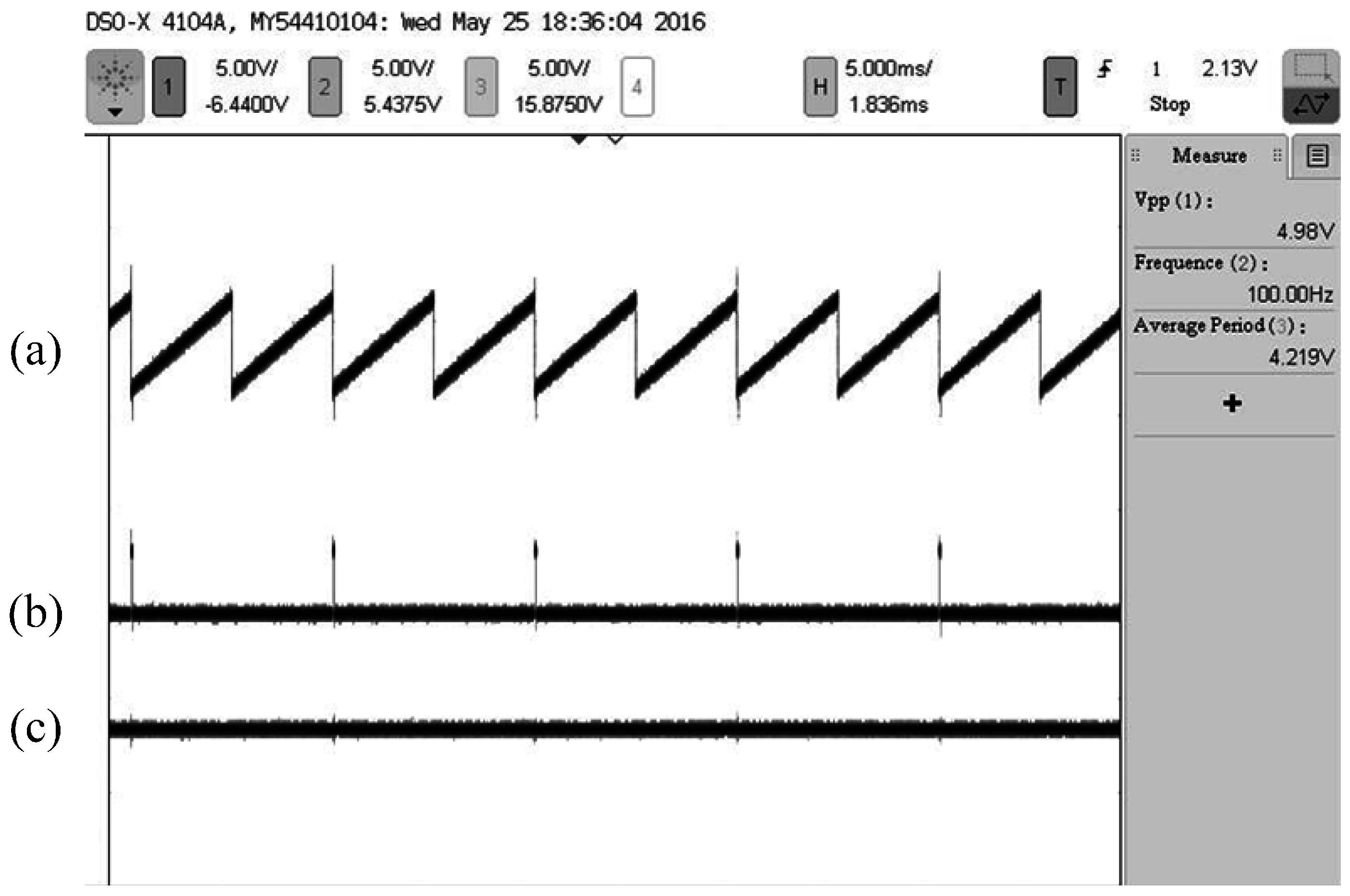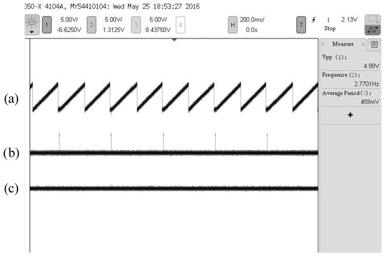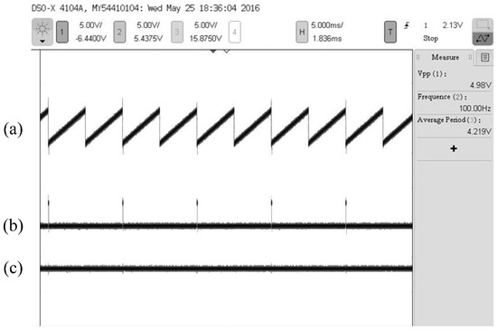 Oscillogram of the sensor output signal with a simulative rotational speed of 100 rps: (a) Angular displacement information; (b) The refresh pulse; (c) Angular velocity information.