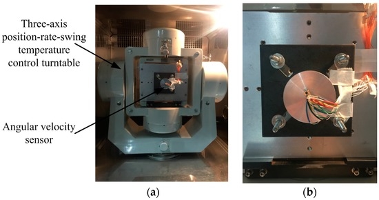 In order to calibrate the angular displacement measurement accuracy of the sensor, test experiments were conducted using a three-axis position-rate-swing temperature control flight turntable. The highest test frequency of the turntable is 1000°/s, with a rate precision error of ±0.01°. The angular velocity sensor is fixed at the heart of the turntable, as shown in Figure 9. The turntable is controlled and adjusted to skew 30°. The rotational test frequency of the inner frame of the turntable is set at different angular rotation frequencies.