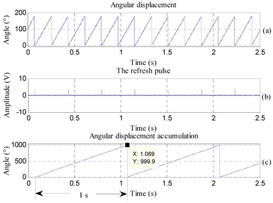 It can be seen from Figure 10 that when rotational test frequency of the turntable is 1000°/s, the corresponding frequency of the refresh pulse stabilizes at 2.770 Hz, which shows that the sensor can accurately detect the initial zero during every cycle and achieve the function of automatic zero clearing during the measurement. Simultaneously, the output STW of the sensor is stable, the initial zero of the STW and the refresh pulse have a one-to-one correspondence. The output DC voltage of the regulation DAC is steady with small ripples, which illustrates that the sensor has stable performance, and the obtained angular displacement is accurate.