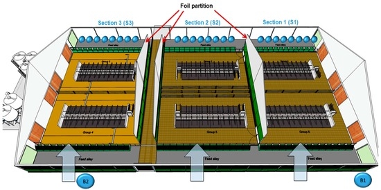 Top view of the barn (68 m × 34 m) showing the three different sections with the sampling points at the lee side of the barn (S1, S2, S3) and the background sampling points (B1, B2).