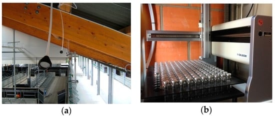 This study focuses on the quantitative acquisition of trace gas concentrations. Therefore, the barn building was divided into three separate air sections. Section 1 and Section 2 (S1, S2) were equipped with a slatted floor, while Section 3 (S3) was equipped with a solid floor system. Two sampling points were installed outside the barn to measure gas concentrations in the background air (B1, B2). The background air was measured at the windward side of the barn, while the gas concentrations in the outgoing air of the equally divided sections were measured at the leeward side (Figure 1). Eight sampling points were merged to form one aggregate sample for each section. The sampling points were located 4 m above the feed alley and were equipped with filter orifices to protect them from dust (Figure 2a).