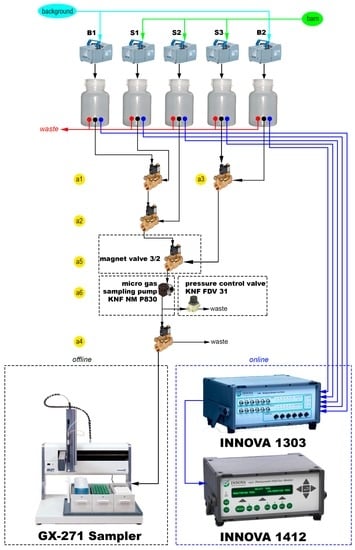 The offline system consisted of magnetic valve switches and a liquid handler system (Liquid Handler GX-271, Gilson, Middleton, WI, USA). This system fills up gas samples into evacuated headspace vials (20 mL) (Figure 3). The system had a capacity for 165 vials (specially customized). Based on the XYZ-technique, it is a compact and space-saving system for measuring under field conditions. The GX-271 sampler is a commercial system controlled by manufacturer software (TRILUTION LH 3.0, Gilson, Inc.). The liquid handler was programmed to prick the evacuated vials after a default time interval. For the offline system, this interval was also 60 s for five samples. One sampling interval was implemented every three hours. The headspace vials were evacuated in the laboratory, so the GX-271 sampler only had to prick the needle into the rubber septum of the vial (Figure 2b). All tubes from the offline system were continuously purged using a micro gas sampling pump (KNF NM P830, KNF Neuberger GmbH, Freiburg im Breisgau, Germany). A pressure control valve was installed (KNF FDV 31, KNF Neuberger GmbH) between the sampling pump and the waste valve to bridge periods of overpressure (Figure 3). Both the online system (serial port, COM 1) and offline system (RJ45 interface) were controlled by the same computer and through remote servicing via the internet. To operate the electrical contacts, the Gilson 506C System Interface (serial port, COM 2) was used. Figure 4 shows the circuit diagram for the 3/2-way magnetic valves of the GX-271 sampler. The magnetic valves were switched for each sampling point (sampling bottles; Figure 3). This is similar to the multiport INNOVA 1303 online system. Figure 4 provides an example of sampling in Section 1. First, the sampling pump was supplied with electricity (a6); second, the 3/2-way magnetic valves were switched (a5, a2, a1) to reach the correct sampling bottle. Magnetic valve a4 was also opened to flush the entire tube system with the selected sampling air. The wait instruction (b1) was the same as the time needed to flush the tube system (20 s). The instruction “move to zone” (c1) made the arm of the GX-271 move to the defined glass vial and prick in. The glass vial was filled over a period of 20 s (b2). Subsequently, magnetic valve a4 was switched for 5 s (b3) to release the overpressure within the vial. Immediately afterwards, the needle was pulled out of the vial (c2), and all electrical contacts were set to off (a6, a5, a2, a1, a4) until the next measurement was started (b4).