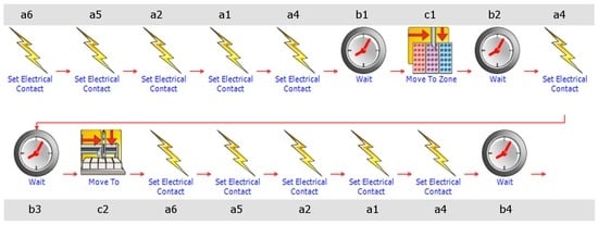 A schematic circuit diagram of the offline system (Gilson Sampler GX-271; Software: TRILUTION LH 3.0, Gilson, Inc.); (a: electrical circuit of the magnet valves and the sampling pump; b: wait times between the processes; c: order from the software to move the arm of the GX-271 in the x-, y-, or z-direction).