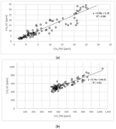 Future studies should collect more measurements, and PAS should be calibrated by time. In addition, calibration gases should be used to test the accuracy of the technique [,]. It is also important to evaluate the analyzers selected for GHG measurements and conduct tests to ensure the chosen analyzers consider the different variations []. GC is a known system that is used to classify and validate other measurement techniques such as PAS and cavity ring-down spectroscopy []. Partly differences between PAS and GC can be caused by interference of diverse reasons. Therefore, it is important to use additional settings like cross and water compensation when measuring with PAS. Furthermore, additional accurate laboratory measurements with test gases are necessary.