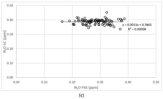 Figure 6 shows the concentrations of CH4, CO2, and N2O in air samples collected via PAS and GC. CH4 and CO2 concentrations showed good correlation between PAS and GC (R2 = 0.88 and 0.82; p < 0.01). The N2O concentration measured by PAS and GC measurement systems showed no correlation (R2 = 0.00008; p > 0.05). In addition, CH4 measurements taken via PAS showed a zero-point drift, but there was a near 1:1 relation (R2 = 0.88) between the CH4 concentrations measured using PAS and GC (Figure 6a). In the lower dispersion of the values, the concentration range of CO2 was more pronounced (R2 = 0.82) compared with CH4 (Figure 6b). Data collected using PAS showed a higher dispersion than those collected using GC. The majority of N2O values using PAS were still below the environmental (background) concentration of 0.35 ppm in a range of 0.16–0.39 (Figure 6c). This was attributed to the zero-point drift of the PAS.