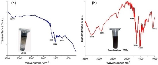Figure 1b shows the FTIR spectra of functionalized MWCNTs. The bands at 3278 cm−1 and 1746 cm−1 can be attributed to O–H/–OH bonds and C=O stretching bonds, respectively. An absorption peak at 1055 cm−1 is due to C–O stretching. Hence, it is conjectured that after functionalization of MWCNTs, hydrophilic carboxyl (–COOH) groups are attached onto the MWCNTs. An absorption band at 2907 cm−1 corresponds to C–H stretching, indicating an increase in the number of sp3 carbon bonds. These bonds are assumed to originate from the breakage of C=C bonds during functionalization [45]. The remaining peaks are the same as described for pure MWCNTs. The insets of Figure 1a,b provide a dispersion comparison of the pure and functionalized MWCNTs. As can be seen from the inset of Figure 1b, the functionalization process resulted in well-dispersed MWCNTs while pure CNTs tend to aggregate in the aqueous medium (Figure 1b)