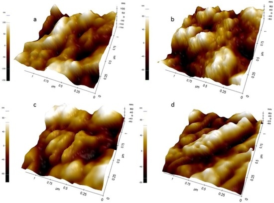 Figure 3a–d shows the atomic force microscopy (AFM) topographic surface analysis for bare-SPCE (a) MWCNTs-SPCE (b), aptamer immobilized MWCNT-SPCE (C) and mucine–aptamer MWCNT-SPCE (d). Phase differences between the samples can be explained from surface roughness, and texture for each fabrication step. It can be seen in Figure 3b that MWCNT modified SPE has regular surface patterns (forest) due to the MWCNT thin layer making the surface smoother as compared to the bare electrode Figure 3a. Additionally, calculated values of surface roughness for bare SPE (0.0512 sq. μm) and MWCNT modified SPE (0.0424 sq. μm) demonstrates the difference between the two fabrication steps. The attachment of biomolecules resulted in a change in the forest like morphology of MWCNTs to “rolling hill” like morphology.