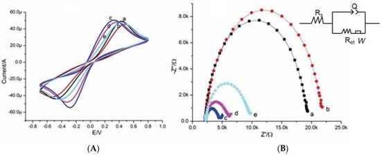 (A) cyclic voltammograms of 2.0 mM [Fe(CN)6]4-/3-probe at scan rate of 100 mV/s and (B) Nyquist plots for (a) bare SPCE, (b) SPCE/MWCNT modified electrode, (c) SPCE/MWCNT/N-(3-dimethylaminopropyle)-N-ethyle-carbodiimide (EDC) activated modified electrode, (d) SPCE/MWCNT/EDC activated/Apt modified electrode, and (e) SPCE/MWCNT/EDC activated/Apt/Mucine modified electrode.