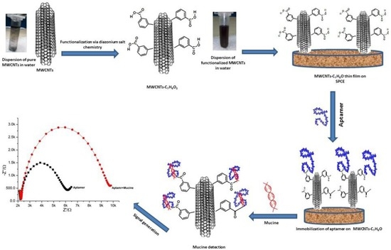 In this work, we present a thin film assembly method of covalently functionalized CNTs on screen printed carbon electrodes in the construction of an electrochemical aptasensor. CNTs were functionalized by employing diazonium salt chemistry, which resulted in CNTs bearing benzoic acid as an organic moiety, and, subsequently, films were fabricated on carbon electrodes using well-dispersed functionalized CNT aqueous solution. This assembly method offers various potential advantages in the construction of biosensors such as no need of any prior chemical modification of carbon electrode surface, use of water as solvent, one step simple fabrication directly from solution using a very small amount of CNTs and reuse of solution used for thin film assembly. Fabrication of a highly selective monolayer with high density of CNTs in small features with complex shapes on screen printed transducers was expected to provide an ideal platform for on-surface chemistry, and thus has been demonstrated in this work. These modified screen printed carbon electrodes were further exploited to develop a very sensitive electrochemical DNA aptamer-based biosensor to detect mucin (MUC1), a prevalent gene associated with breast cancer [16]. Breast cancer is the most common malignancy among women and the leading cause of cancer mortality worldwide [17]. Early diagnosis and timely therapy could be the most effective ways to improve the survival rate at present. There are also other serum markers that are linked to breast cancer and may be used in clinical practice, including BRCA1, BRCA2, and CA 27.29 carcinoembryonic antigen (CEA), polypeptide antigen (TPA), cytokeratin 19 fragment (CIFRA-21-1), tissue polypeptide specific antigen (TPS), human epidermal growth factor receptor 2 (s-HER2), platelet-derived growth factor (PDGF), vascular endothelial growth factor (VEGF) and osteopontin (OPN) [18,19]. In recent years, a new class of cancer biomarkers has been identified as miRNAs, which is successfully exploited to screen cancer at early stages [20,21]. miRNAs exhibit abnormal levels of expressions during breast cancer [22]. In literature, a number of aptasensors have been reported which have been used for detection of breast cancer biomarkers. Recently, highly sensitive label free electrochemical detection of VEGF has been reported by Shamsipur et al. using an anti-VEGF165 aptamer immobilized on a composite glassy carbon electrode [23]. Some other research groups have also devised electrochemical biosensors for VEGF detection [24,25,26]. A direct aptamer based detection of osteopontin in serum samples has been reported by Cao et al. [27]. Different strategies also have been developed for electrochemical detection of a PDGF biomarker that can be applied to monitor breast cancer tumor progression [28,29,30,31,32,33,34].