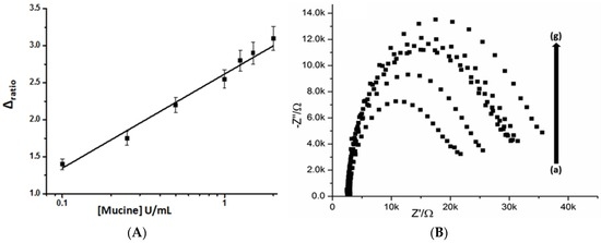 After optimization of experimental parameters, an EIS aptasensor was employed for the quantitative analysis of mucine. Ret values were calculated and presented as ∆ ratio in the graph. The calibration curve and linear range for mucine detection were presented in Figure 6A. Experimental results show that net Ret increased as the mucine concentration increased, originating from the binding of aptamer modified electrode surface with the bulky mucine molecules. The original impedimetric signals are also shown in Figure 6B as Nyquist plots. The specific mucine–aptamer interaction induced an increase of ∆ ratio. A very low limit of detection (0.02 U/mL) with a linear range from 0.1 U/mL to 2 U/mL was achieved without any additional amplification step. Similarly, the observed dissociation constant of the assays was 0.63 µM, which is approximately equal to 0.1 U/mL. An analytical performance comparison of the proposed aptasensor with previously reported electrochemical sensors for detection of MUC1 is provided in Table 1.