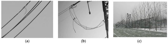 Damages caused by conductor galloping: (a) depiction of the damages caused by conductor broken stocks; (b) depiction of the damages caused by tension fitting fracture, and suspension clamp breakage; (c) depiction of the damages caused by tower collapses.