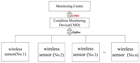 The online monitoring technology of conductor galloping of transmission lines mainly comprises wireless sensor modules, a condition/state monitoring device (CMD), and condition monitoring center [], as shown in Figure 2. The wireless sensor module is responsible for collecting the conductor galloping data and sending it to the CMD using a ZigBee network. The CMD is installed on the tower and receives data from the wireless sensor modules and transmits them to the monitoring center by a GPRS network. Expert software installed in the monitoring center can display line status information, diagnose running status, alarm, and forecast potential breakdowns.