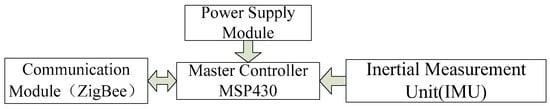 The wireless sensor module, as shown in Figure 3, includes four units: an inertial measurement unit (IMU), a master controller, a power supply unit, and a wireless communication unit. Each unit will be briefly introduced as follows.