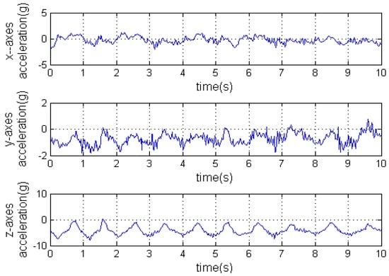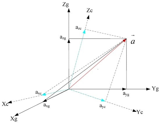 To avoid errors caused by conductor twisting, all the characteristic quantities are calculated with respect to the geographical coordinate frame, that is to say, the accelerations (i.e., axc, ayc and azc) with respect to the carrier’s coordinate frame are transformed into accelerations (i.e., axg, ayg and azg) with respect to the geographical coordinate frame before calculation (as shown in Figure 5) using the following relationships: