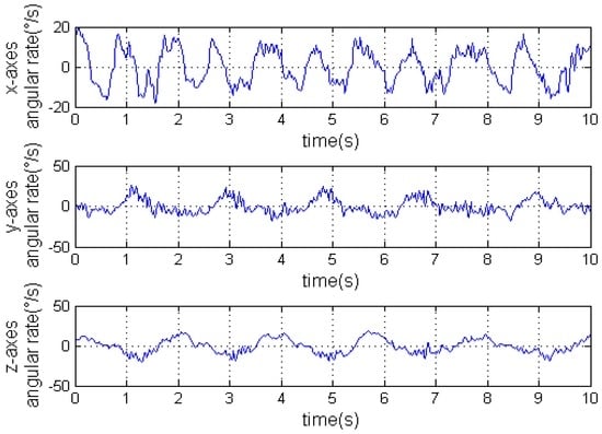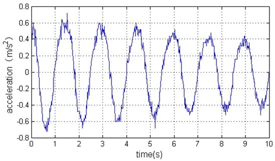 Once C is worked out, we can get the accelerations with respect to the geographical coordinate frame using Equation (1). Figure 9 is the accelerations with respect to the carrier’s coordinate frame measured by the IMU. Figure 10 is the angular rates measured by the IMU. Finally, the accelerations with respect to the geographical coordinate frame on the Y axis can be seen in Figure 11.
